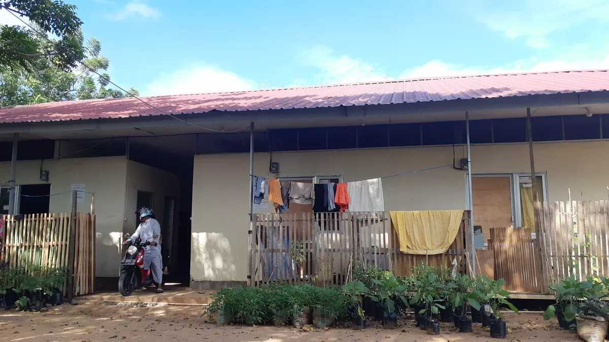 Penghuni hunian sementara bersantai di depan bilik di kompleks huntara Kelurahan Mamboro Induk, Kecamatan Palu Barat, Kota Palu, Sulteng, Selasa (24/9/2019). Huntara ditempati penyintas gempa, tsunami, dan likuefaksi sambil menunggu selesainya pembangunan hunian tetap. (Videlis Jemali/Kompas)