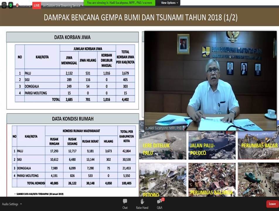 Kegiatan yang diikuti ratusan peserta secara virtual dan dimoderatori Supartoyo itu menghadirkan narasumber lain, yakni Kepala Bidang Mitigasi Gempa Bumi dan Tsunami Pusat Vulkanologi dan Mitigasi Bencana Geologi Badan Geologi Kementerian ESDM Sri Hidayati. Ia menyatakan, kejadian di Palu dan sekitarnya diawali dengan gempa bumi. Menurutnya gempa bumi memiliki tiga bahaya yakni sesar di permukaan, guncangan gempa bumi, dan bahaya ikutan seperti gerakan tanah atau longsor, likuefaksi, dan gelombang tsunami yang dipicu oleh longsoran bawah laut.
